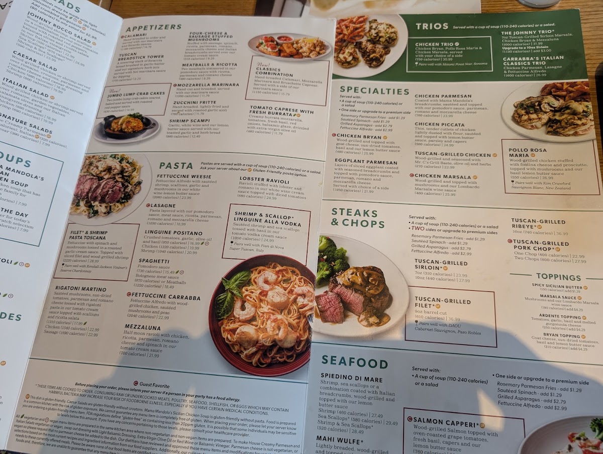 Complement your meal with tempting sides such as Parmesan Truffle Fries, sautéed greens, or garlic mashed potatoes. The menu’s thoughtfully crafted combinations like The Johnny Tuscan and Chicken Trio bring variety and depth to the dining experience. Patrons praise the attentive service and inviting atmosphere, making Carrabba’s a top choice for both casual outings and special occasions.